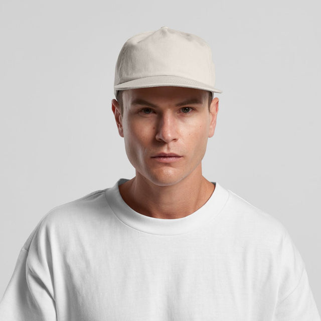 Mid profile, five panel cap, internal mesh structure support, flat peak, adjustable fastener with metal clasp, tonal under-peak lining, tear-out AS Colour label.