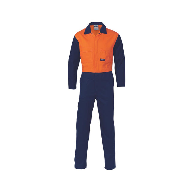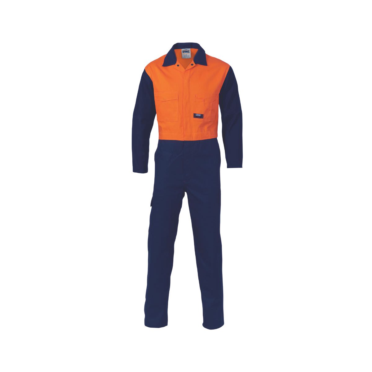 - Fabric: 311 gsm Cotton Drill Two Tone HiVis Coverall with flap cargo pocket on lower leg. Press studs & gusset sleeves.