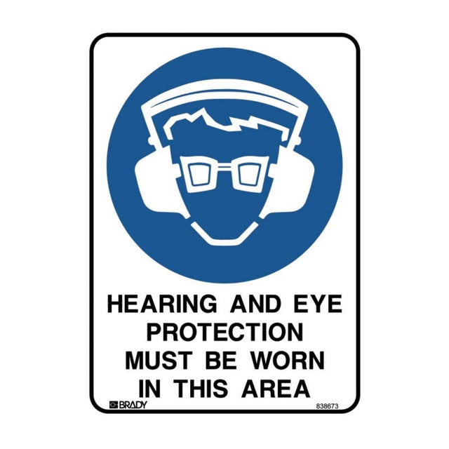 Hearing And Eye Protection Must Be Worn In This Area - 180 x 250mm / Self Adhesive is backordered and will ship as soon as it is back in stock.