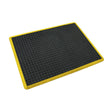 The Air Grid Mat is a hard wearing, heavy duty, 100% natural rubber anti-fatigue Mat. The raised square surface provides excellent comfort, while the rippled pattern gives extra traction and the suction caps on the mat base keep the mat in place on hard surfaces. Non trip safety edges come standard on all four sides and are available in a yellow option to increase visibility of mat warning of potential hazards. This mat is suitable for use in wet or dry, heavy use environments where comfort and relief is needed from standing on a hard surfaces. This product is stocked in two standard sizes or it can be custom made to length in runners or to shape to fit into a specific area.