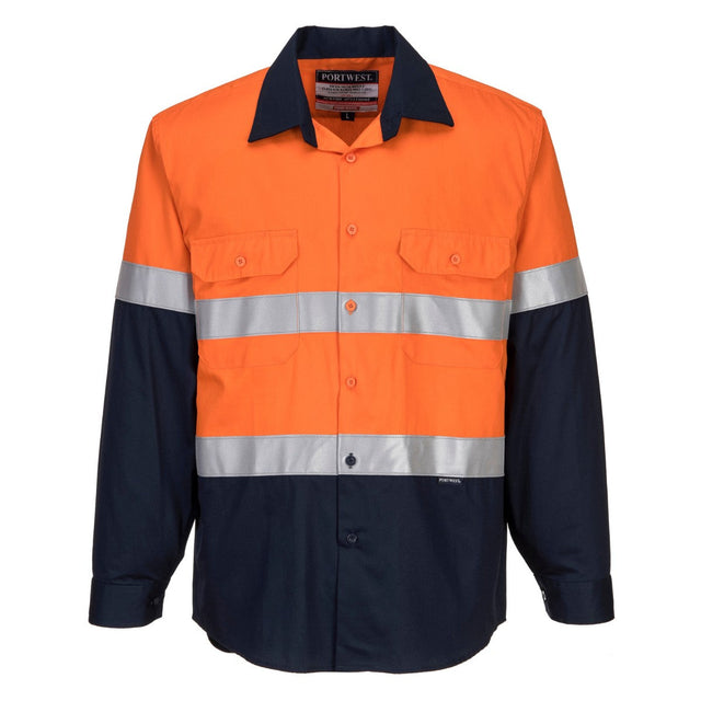 Portwest Flame Resistant Shirt MF101 - Orange/Navy / S is backordered and will ship as soon as it is back in stock.