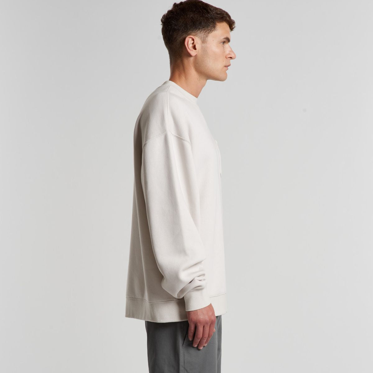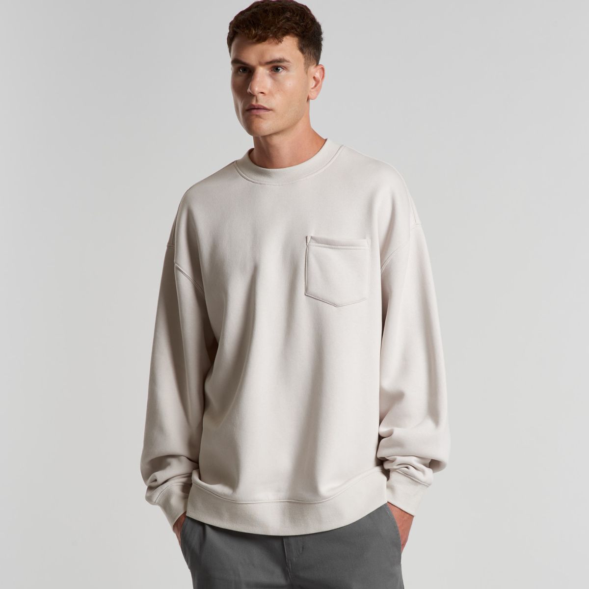 Pullover Crew, drop shoulder, crew neck, sleeve cuff ribbing, breast patch pocket, pre-shrunk to minimise shrinkage.