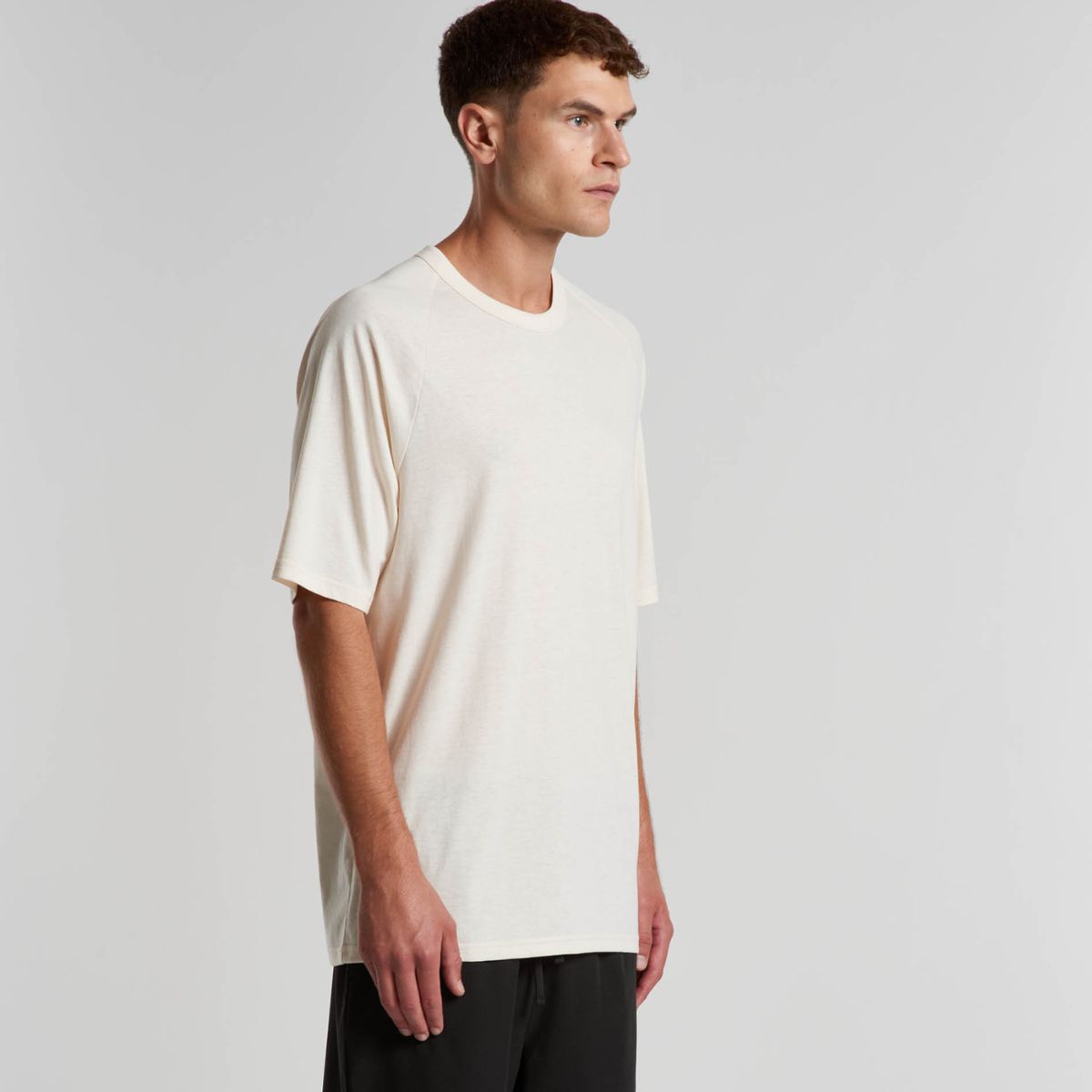 Self-fabric binding on neck, raglan sleeve, side seamed, shoulder to shoulder tape, double needle hems, preshrunk to minimise shrinkage, suitable for low to medium impact activities.