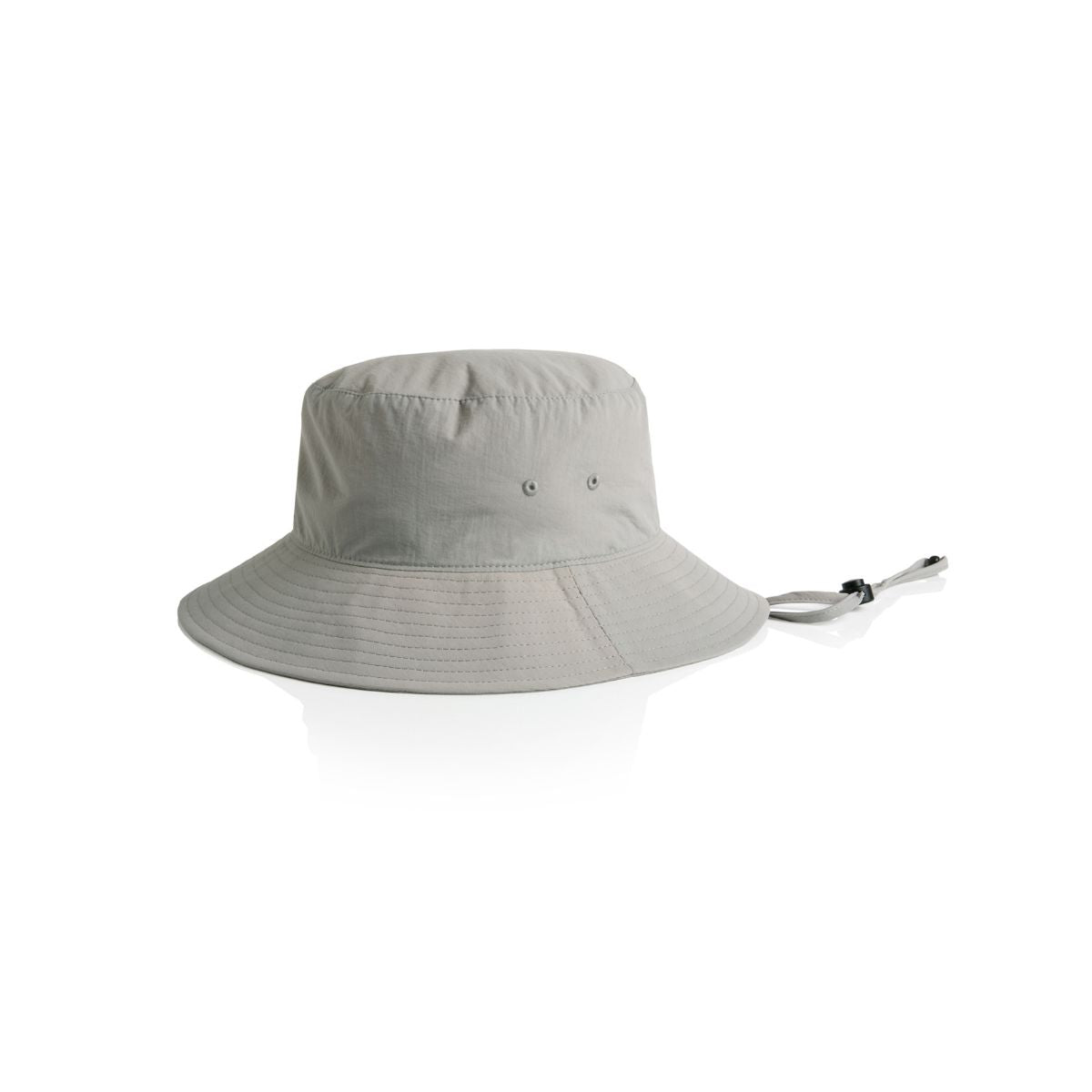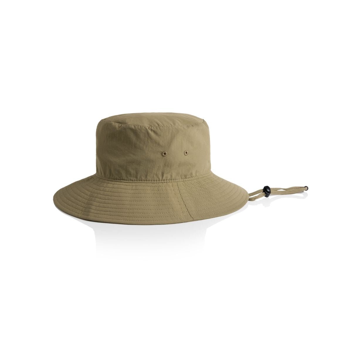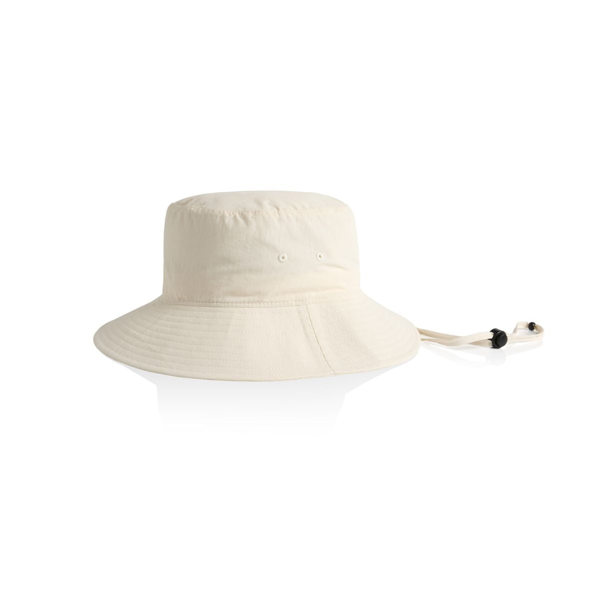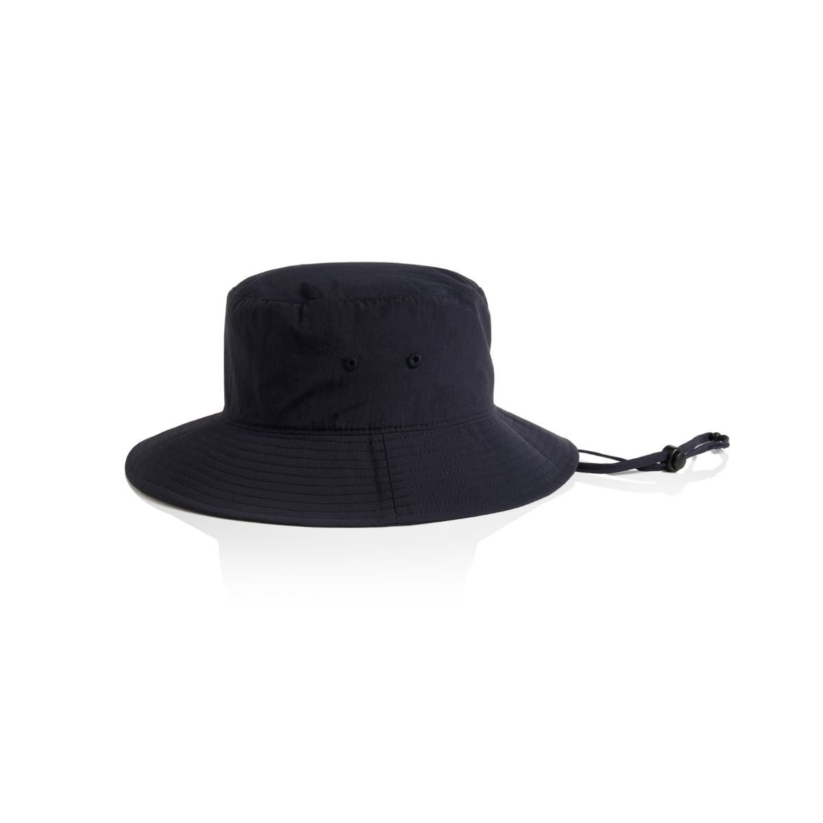 Reinforced large brim with stitching detail, side eyelets, self-fabric chin strap, plastic adjustable toggle, tear-out AS Colour label.