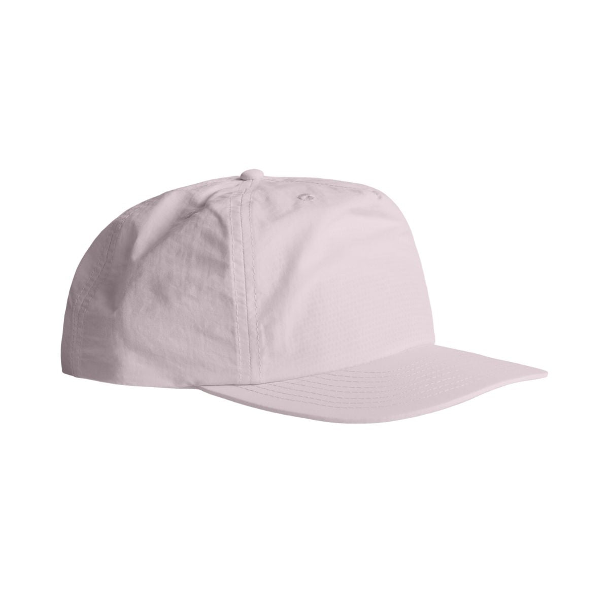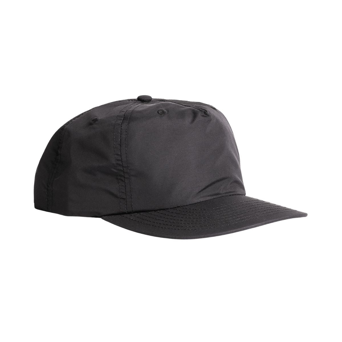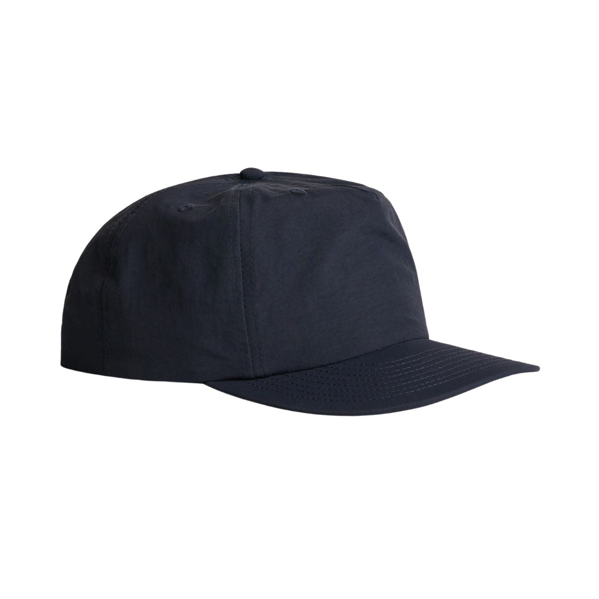 Mid profile, snapback cap, single panel at front, plastic snapback, tonal under-peak lining, mesh structure support, flat peak.