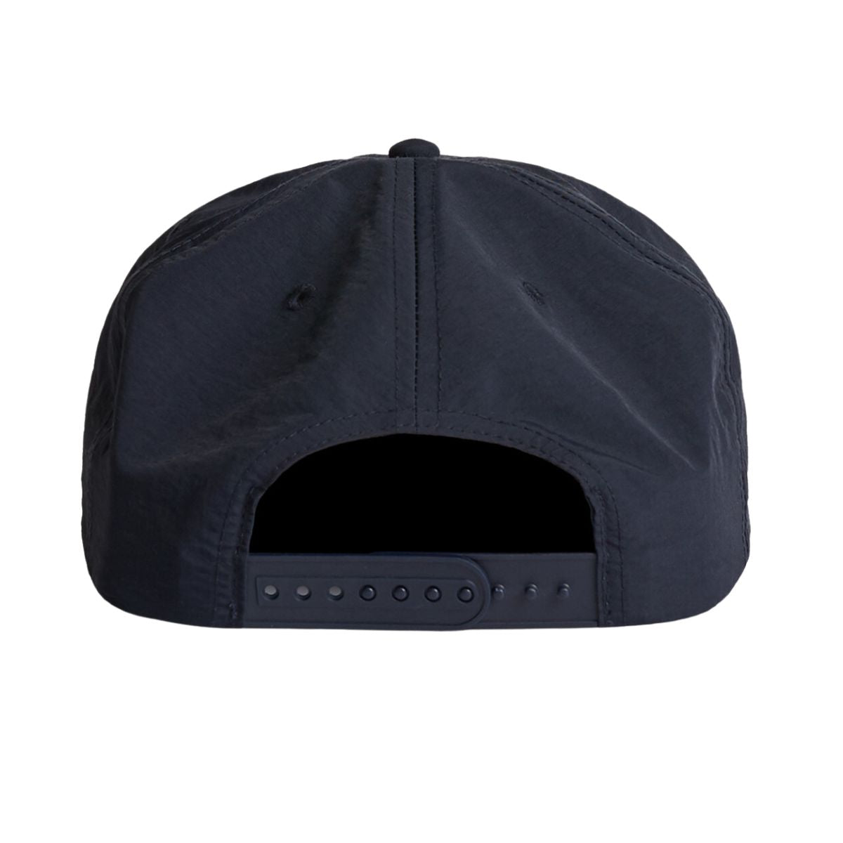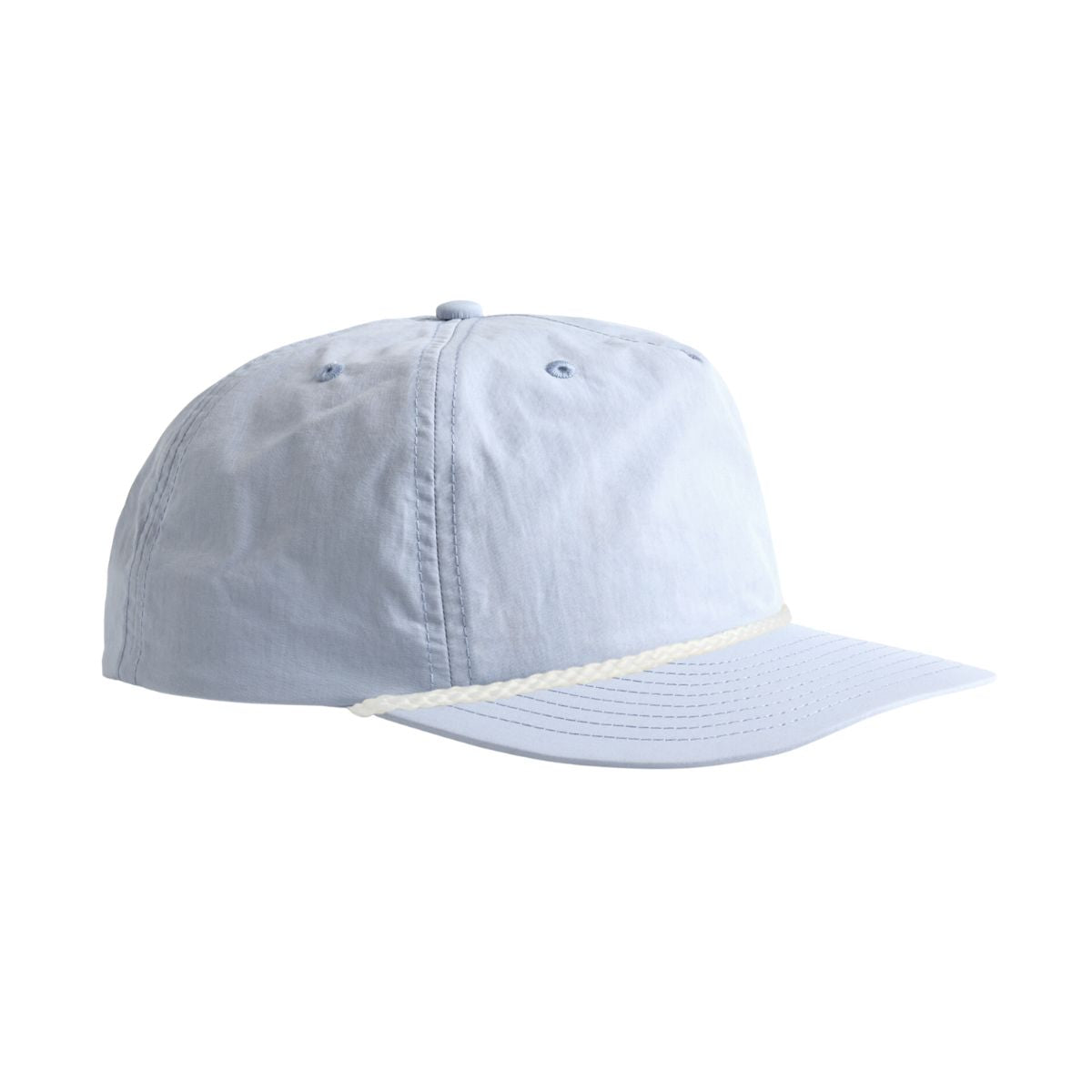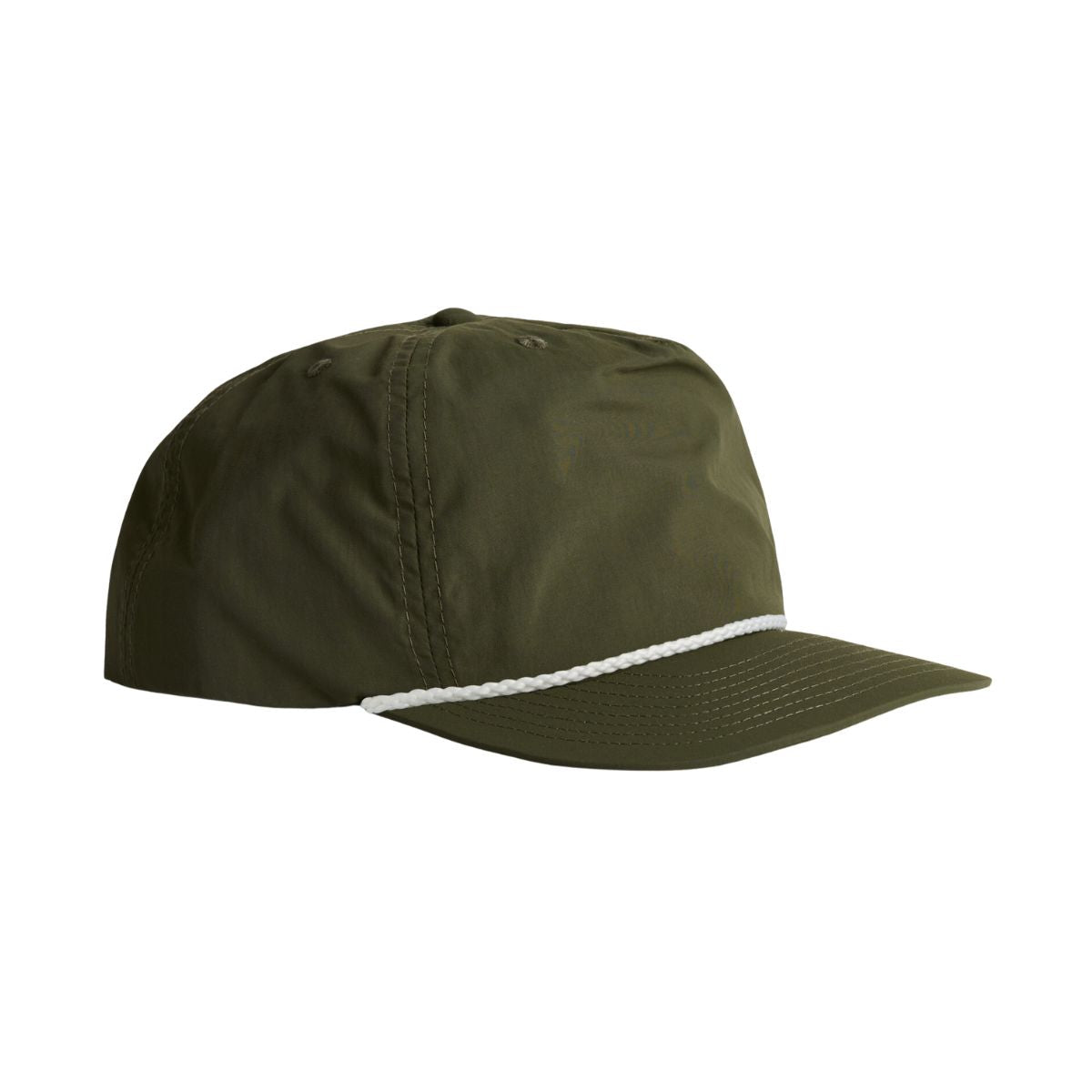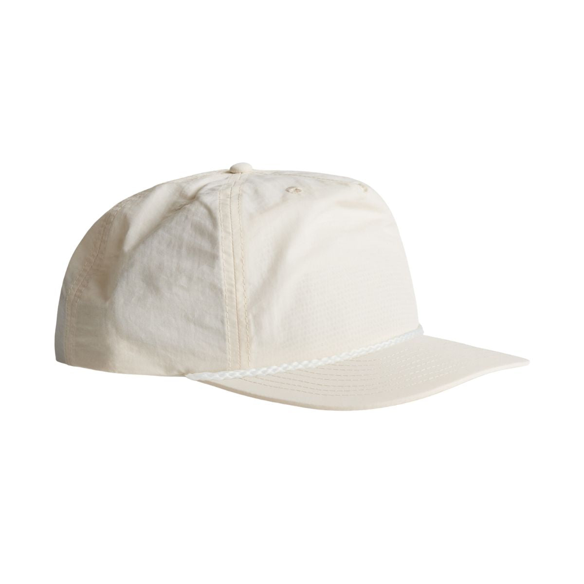 Mid profile, snapback cap, single panel at front, plastic snapback, tonal under-peak lining, mesh structure support, contrast matte nylon rope at front of crown, flat peak, tear-out AS Colour label.