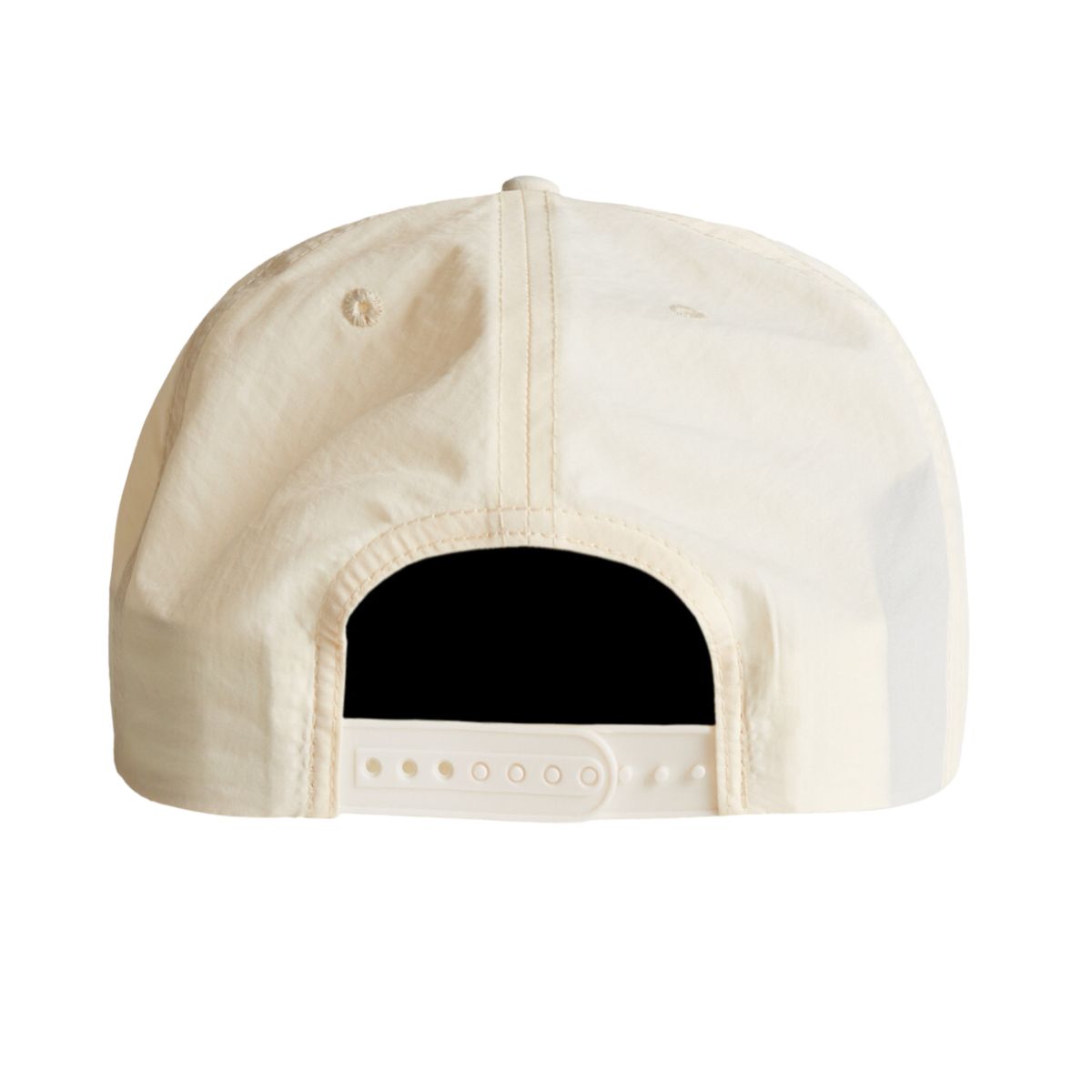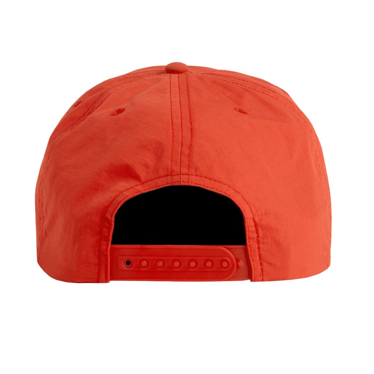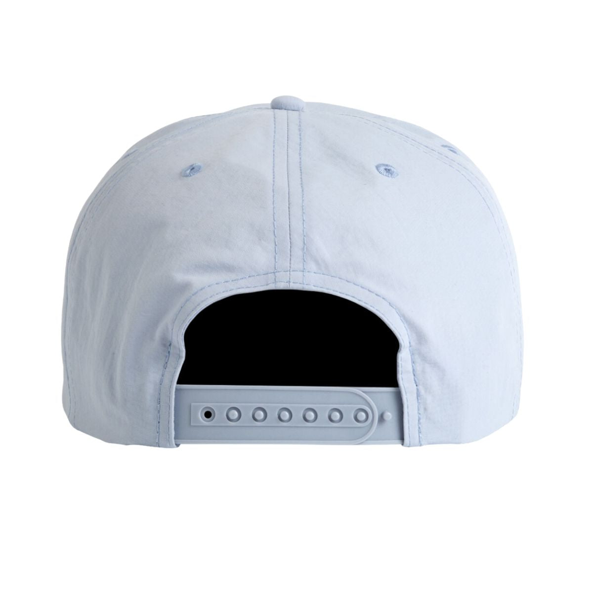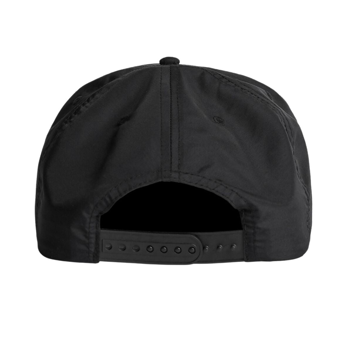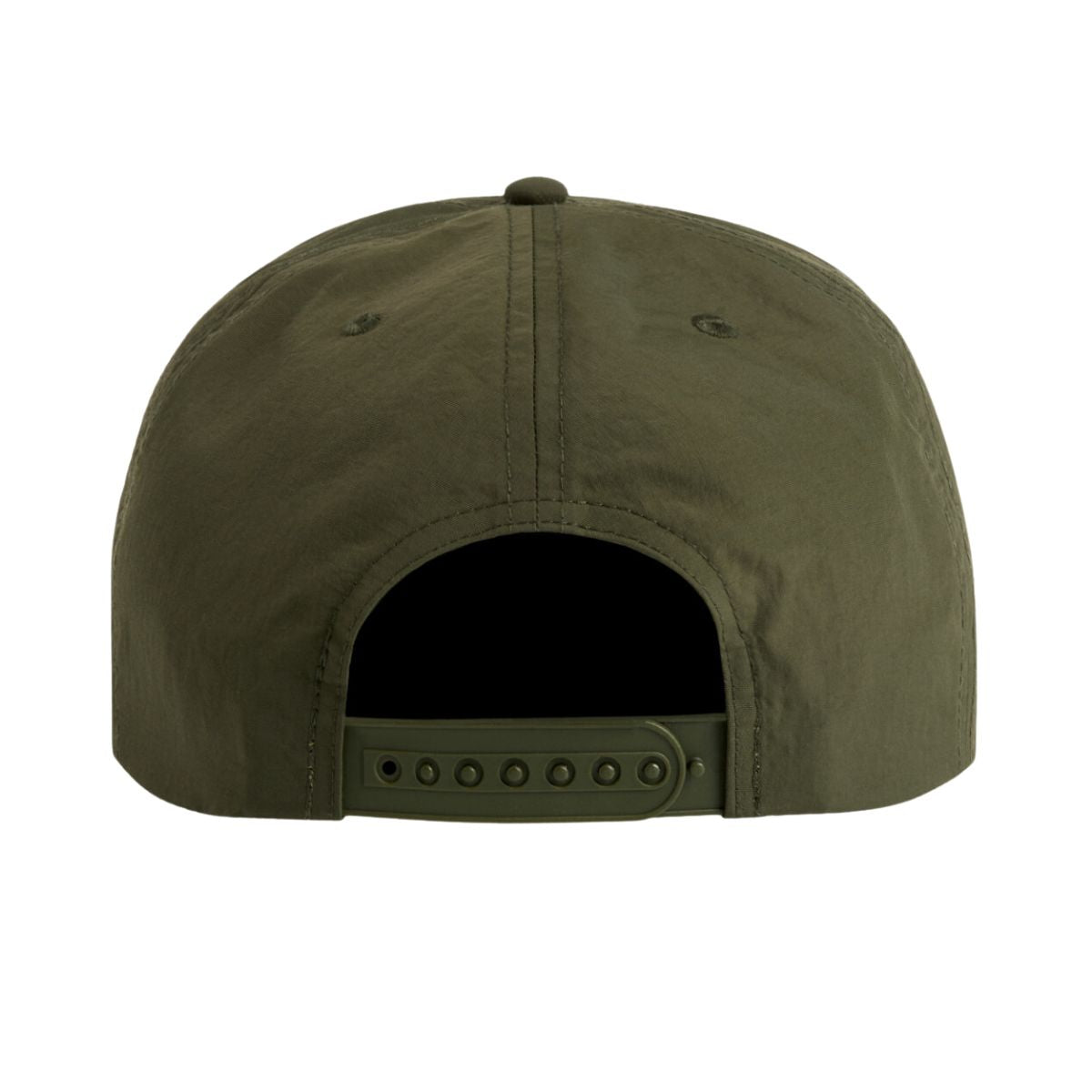 Mid profile, snapback cap, single panel at front, plastic snapback, tonal under-peak lining, mesh structure support, contrast matte nylon rope at front of crown, flat peak, tear-out AS Colour label.