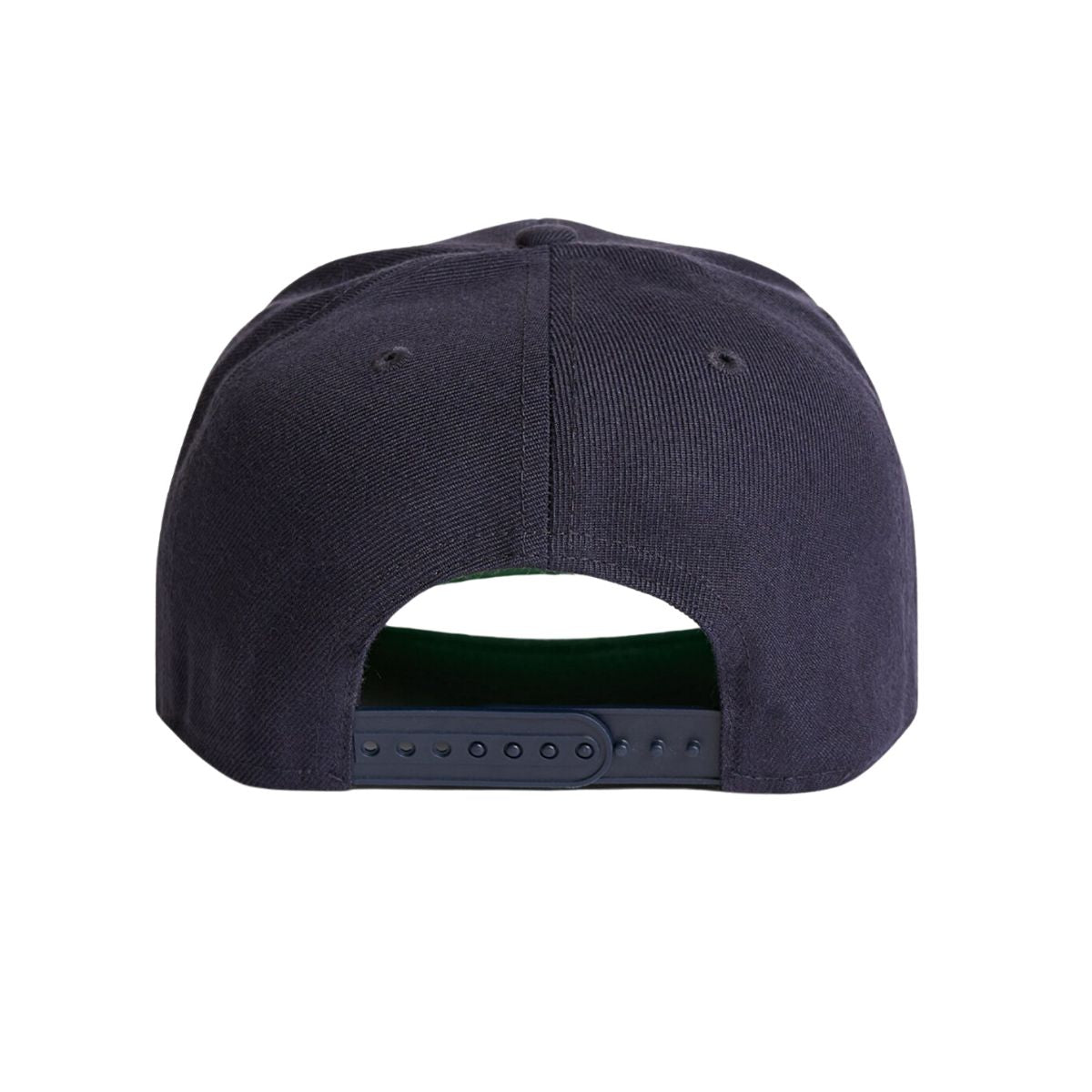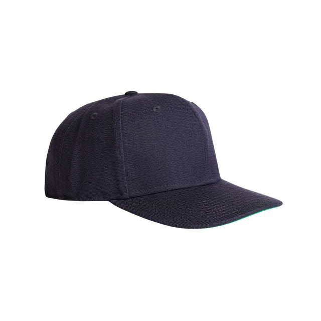 High profile snapback cap, plastic snapback, green under-peak lining, stitching eyelets, self fabric dome at top, flat peak, tear-out AS Colour label.